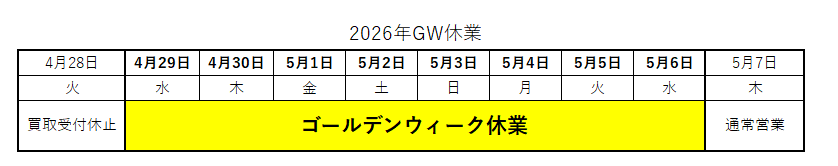 2026/4/28(水)~2026/5/6(水)まで買取受付を休止致します。